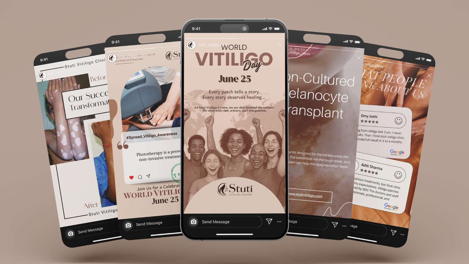 Stuti Vitiligo Clinic approached us with a powerful mission to offer personalized, science-backed treatment for vitiligo in a way that feels approachable, trustworthy, and deeply human. But the challenge was significant: vitiligo is often misunderstood, and most clinics in the space lean heavily into sterile, clinical branding that creates distance rather than connection. Stuti needed a brand identity that balanced medical credibility with emotional comfort, resonated with people of all ages and skin types, and stood out both in the competitive wellness space and on social media. The goal? Build trust at first glance, spark confidence, and normalize the conversation around skin conditions without losing professional integrity.
